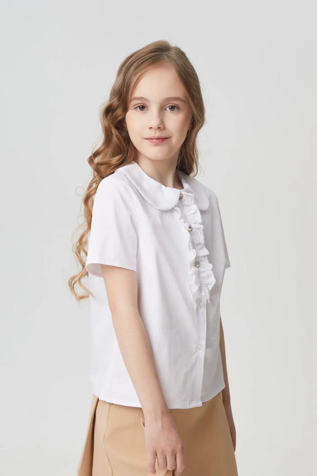 Элегантная белая блузка с короткими рукавами для девочки. Модель с круглым отложным воротником из дышащей ткани на основе хлопка, декорированная изящными оборками и дизайнерскими пуговицами будет прекрасным дополнением гардероба школьницы.