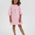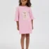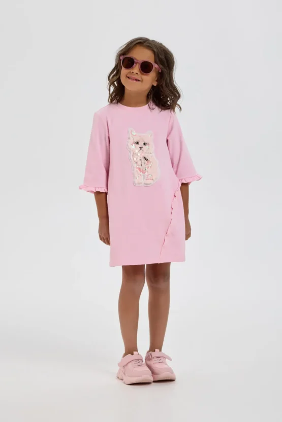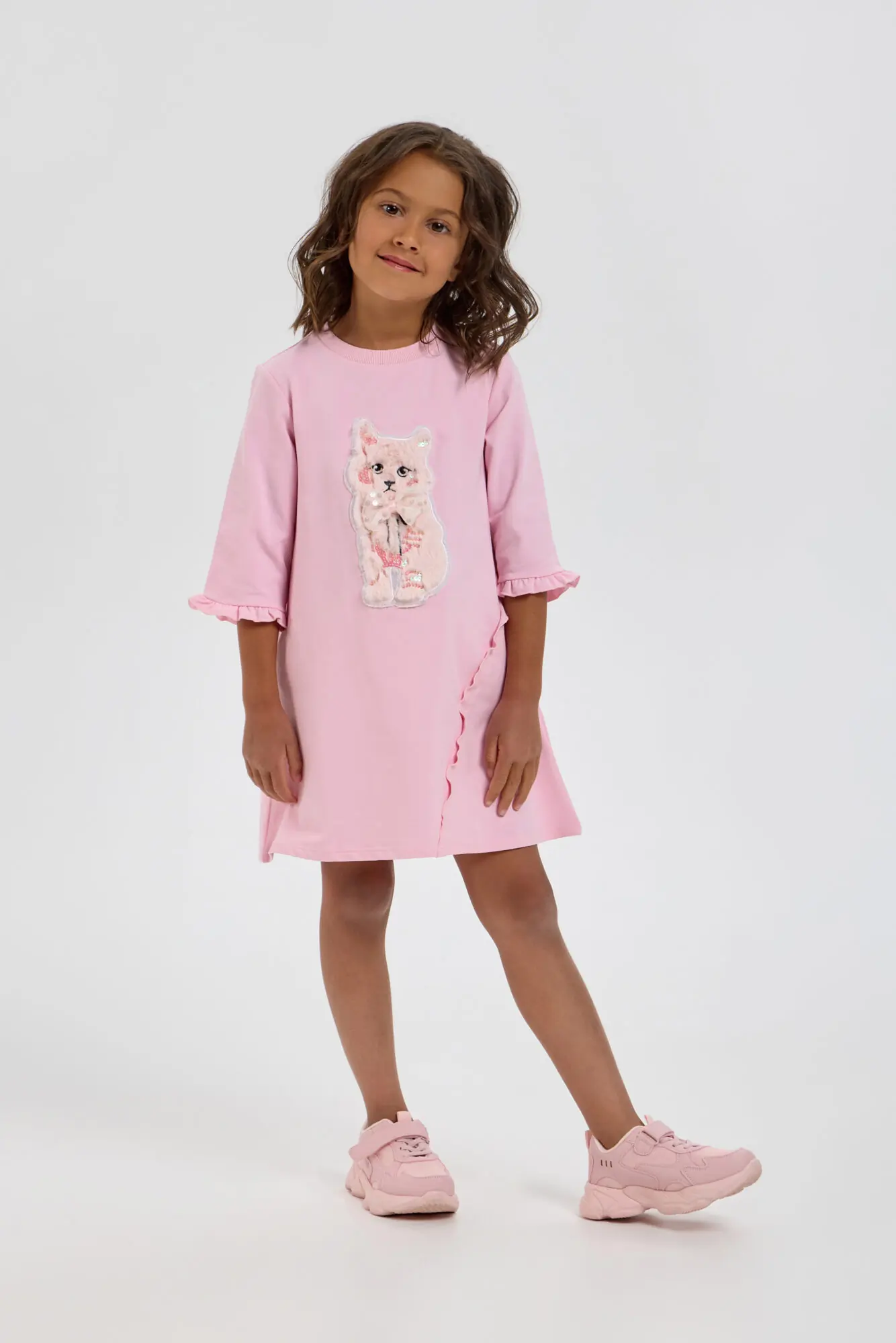 Յուրօրինակ աղջկական զգեստ՝ պատրաստված պաստելային վարդագույն ջերսիից: Զգեստն ունի ազատ ձև և երկար թևքեր: Կլոր դեկոլտեը ուշադիր մշակված է զարդանախշերով: Ծավալուն դեկորատիվ ապլիկացիան և ասիմետրիկ ծալքերը յուրահատուկ հպում են հաղորդում: Դրա յուրօրինակ դիզայնը և վառ զարդարանքը այս զգեստը դարձնում են կատարյալ ընտրություն ինչպես առօրյա հագուստի, այնպես էլ հատուկ առիթների համար: