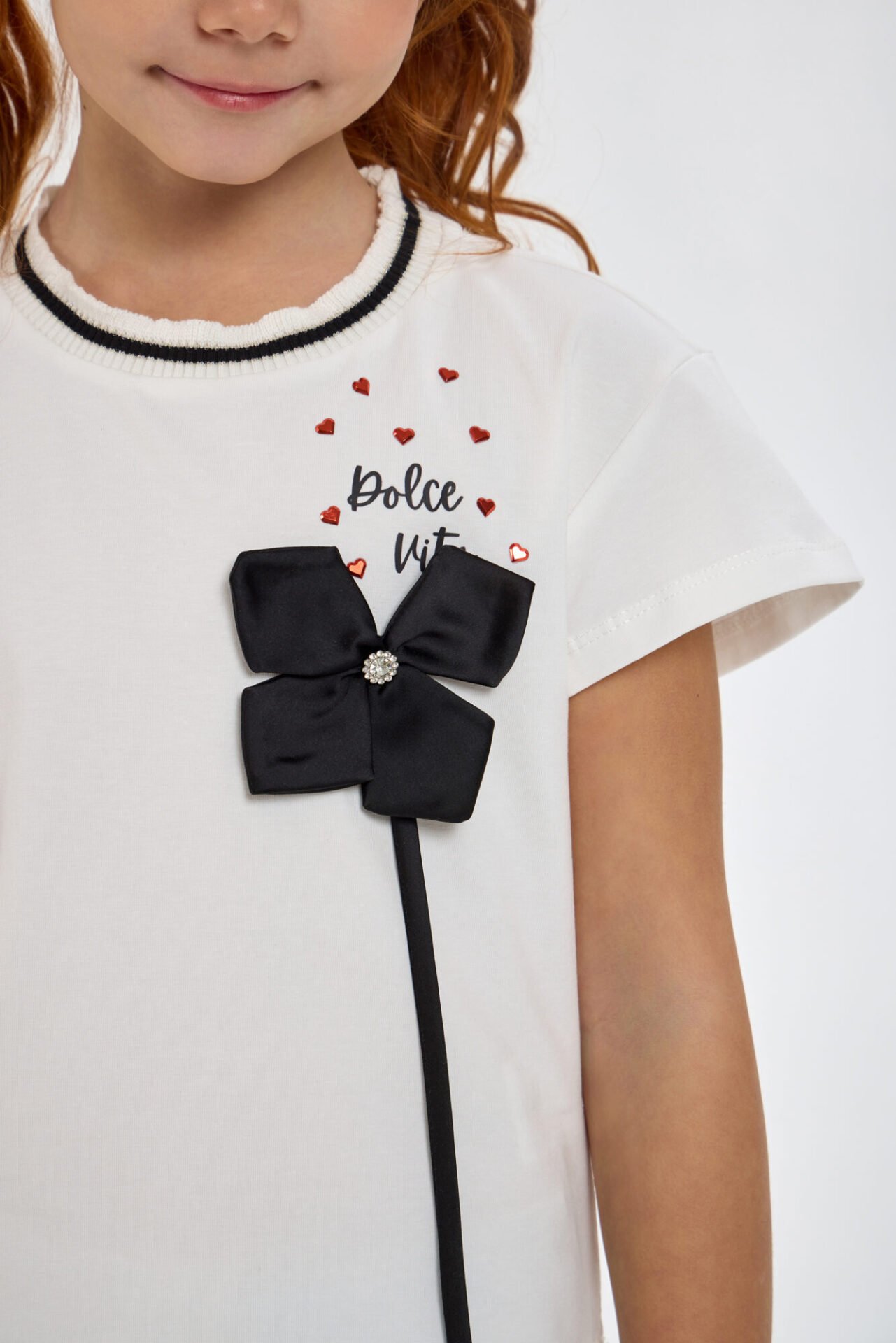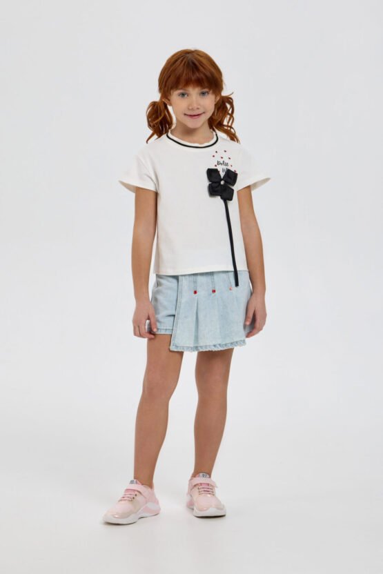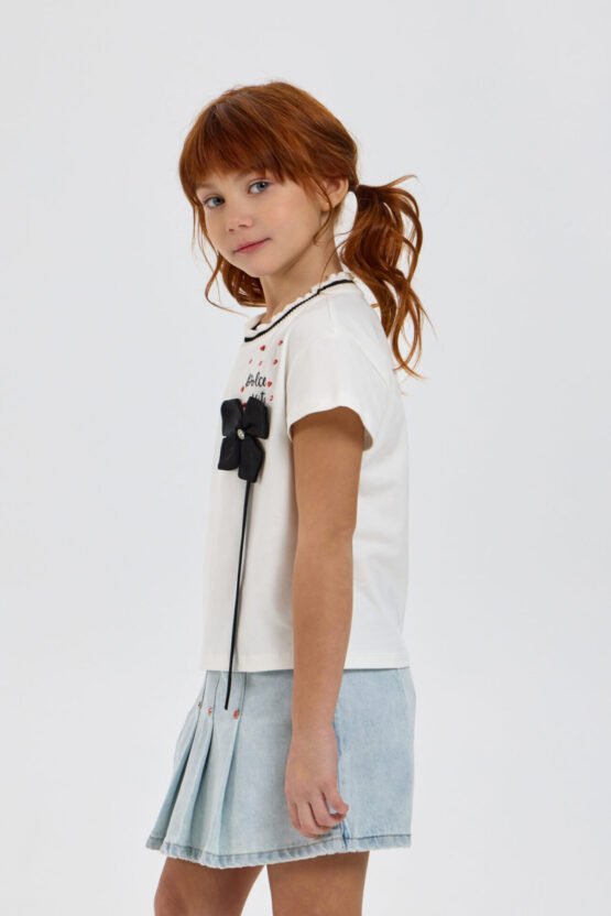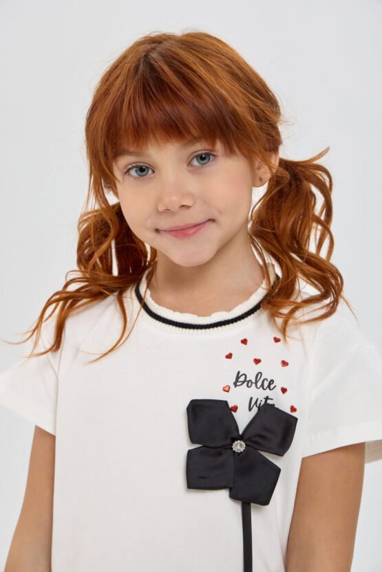 Աղջկա համար նախատեսված դեկորով բլուզը ոճային և նորաձև զգեստապահարանի տարր է, որը ուշադրություն է գրավում իր օրիգինալ դիզայնի շնորհիվ։ Ազատ ձևվածքով մոդելը ունի կարճ թևքեր։ Կլոր վզի բացվածքը զարդարված է գործված եզրագծով՝ կոնտրաստային զոլերով և եզրին վոլանով։