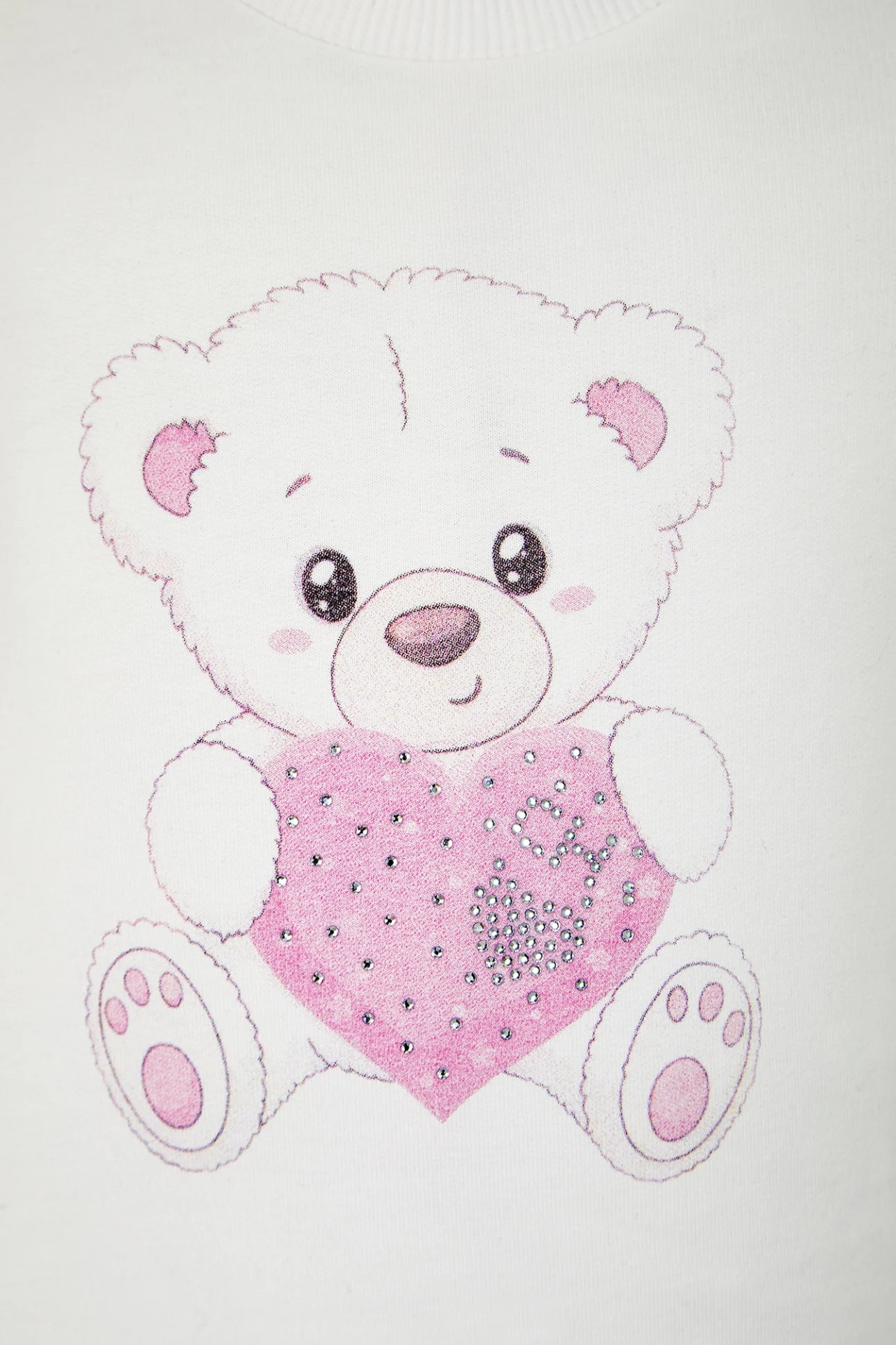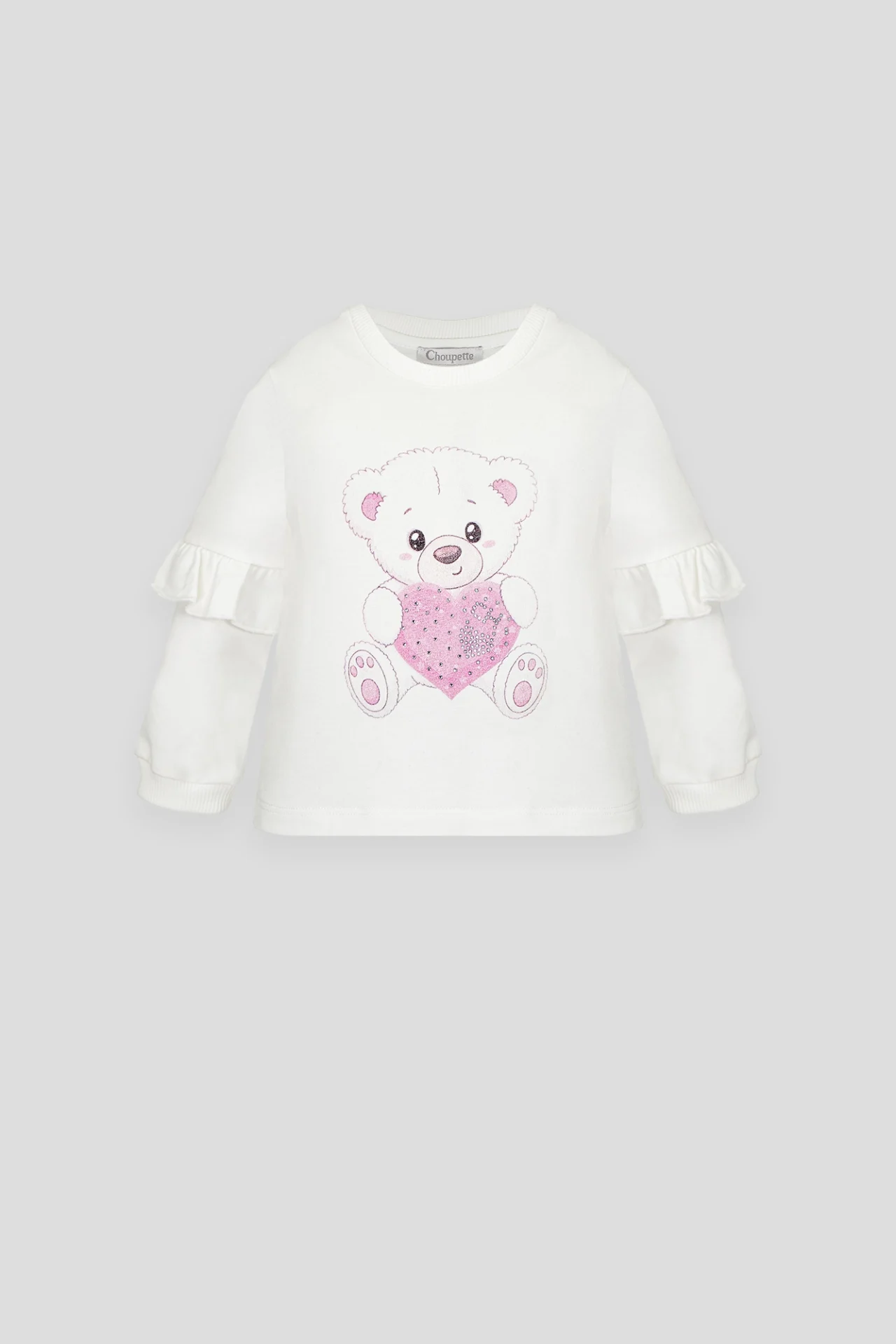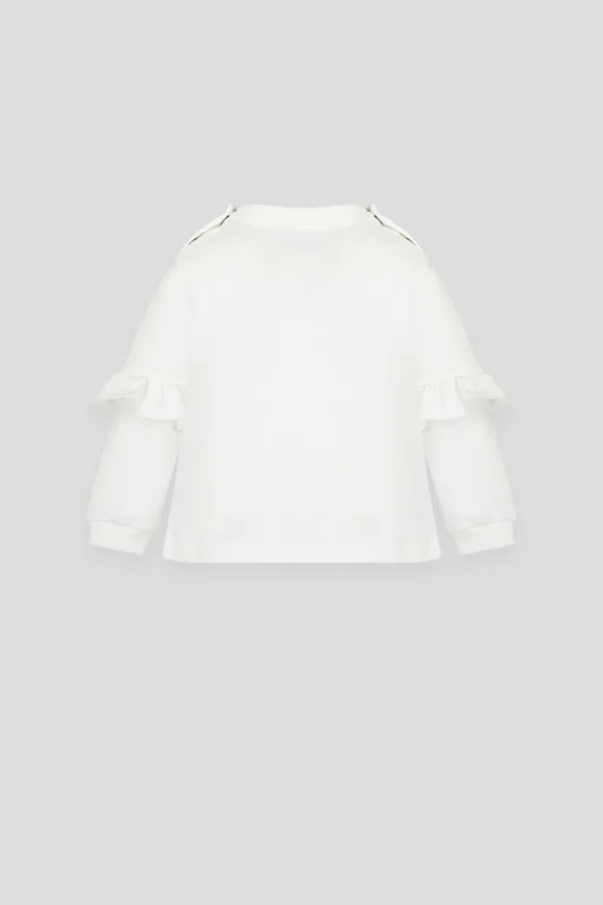 Աղջկա համար նախատեսված իդեալական սվիթշոթը կդառնա գարուն-ամառ սեզոնի իսկական մարգարիտը։ Ազատ սիլուետով մոդելը՝ կլոր վզի բացվածքով, կարված է նուրբ բամբակյա տրիկոտաժից։ Երկար թևքերը զարդարված են նրբագեղ վոլաններով։ Ուսային կարի հատվածում տեղադրված սեղմակ-կոճակներով փակումը հագցնելու գործընթացը դարձնում է առավել հարմարավետ։