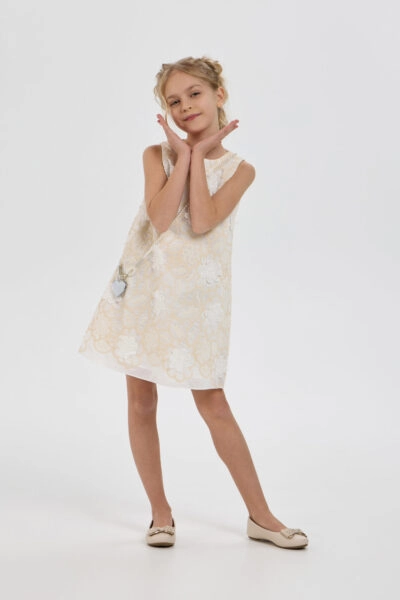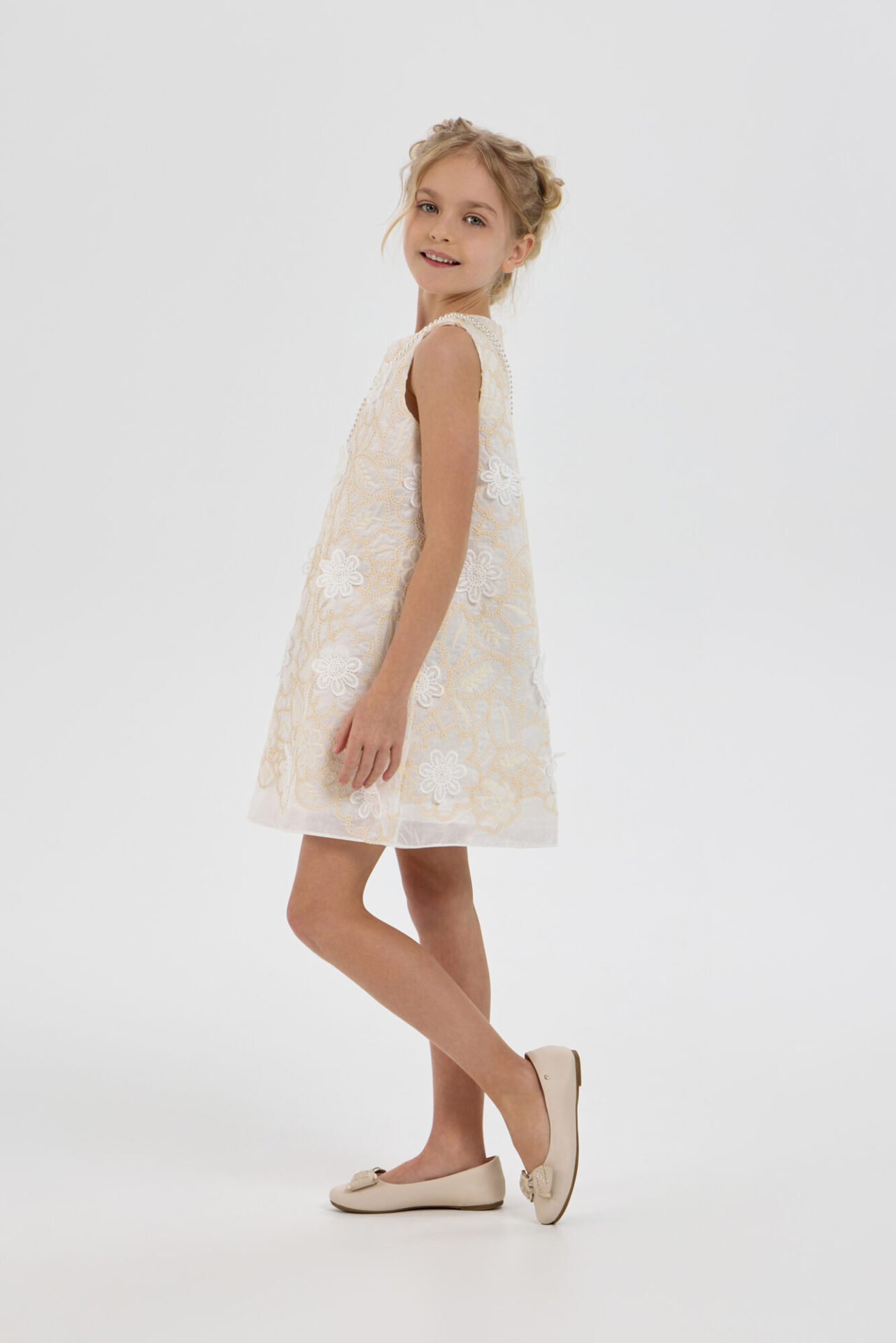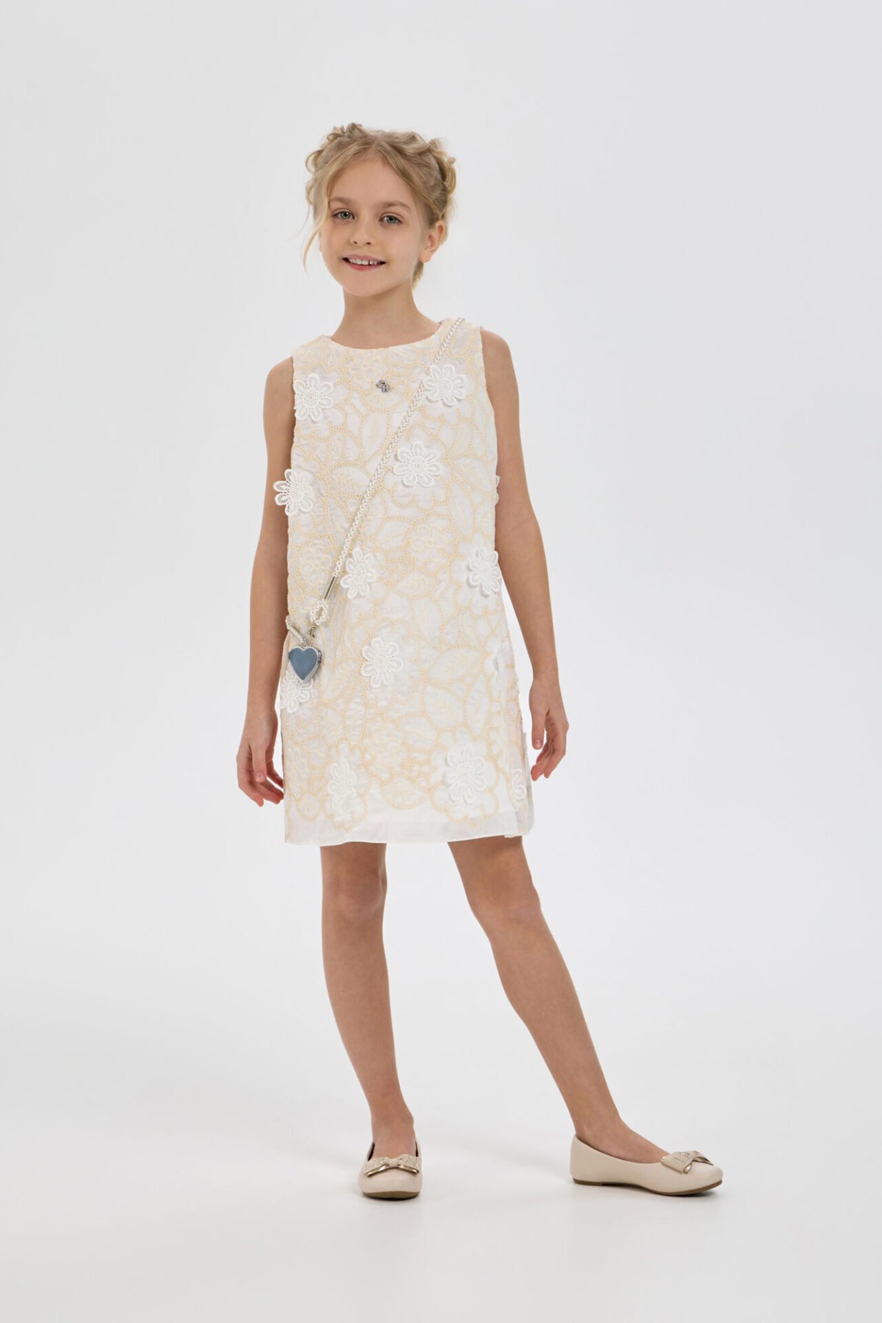 Այս նուրբ կրեմագույն զգեստը՝ նրբագեղ ուրվագիծով, կատարյալ ընտրություն է թե՛ հատուկ առիթի, թե՛ առօրյա զբոսանքի համար: Դրա պարզ կտրվածքը ապահովում է նրբագեղ և էլեգանտ տեսք: Դրա աչքի ընկնող առանձնահատկություններից են ծավալուն ծաղկային զարդարանքները և նուրբ ուլունքազարդ զարդը: Հետևի մասը ունի կայծակաճարմանդ: Աստառը պատրաստված է բնական բամբակից: Այն կատարյալ ընտրություն է աննկատ և ռոմանտիկ տեսքի համար