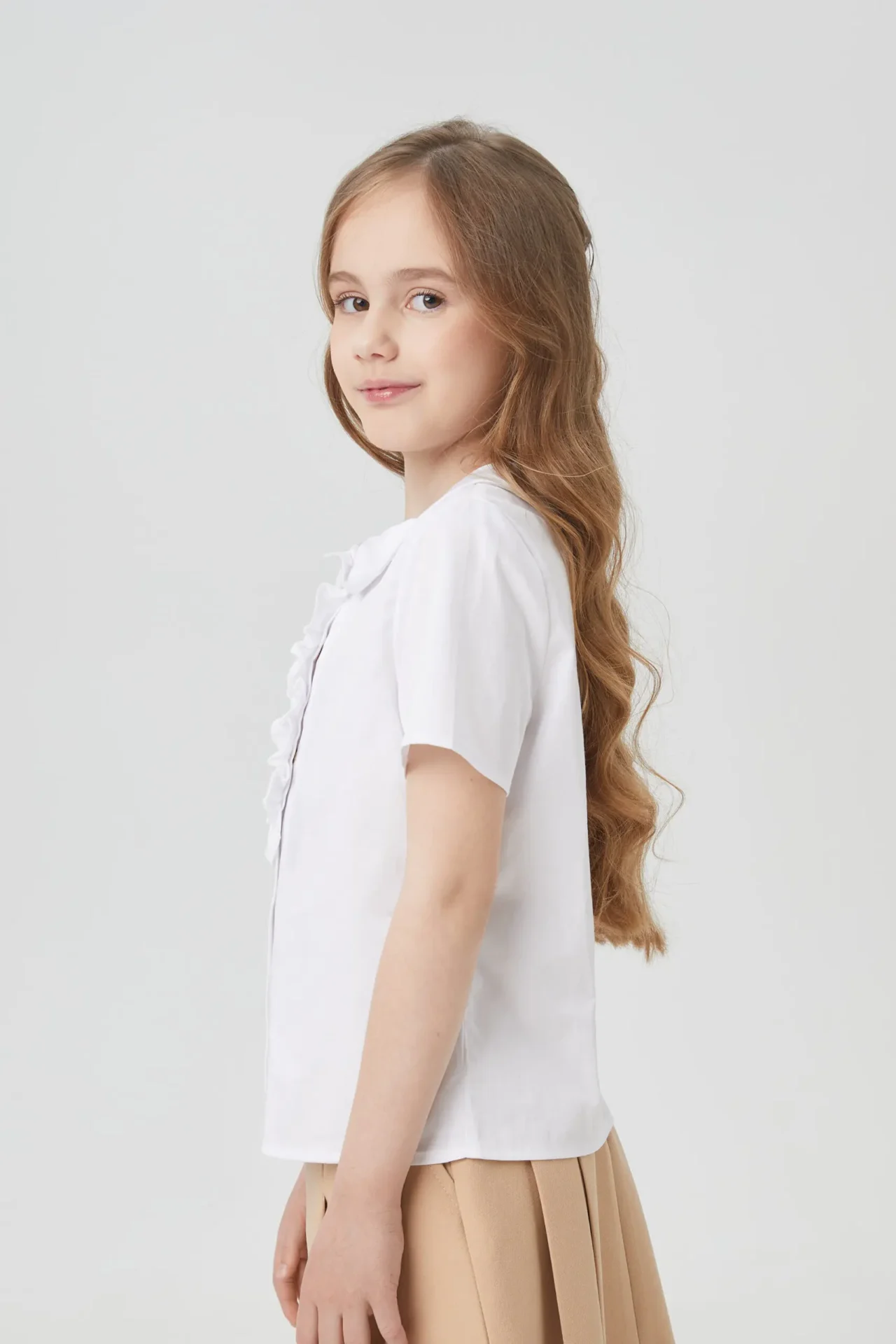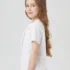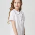 Элегантная белая блузка с короткими рукавами для девочки. Модель с круглым отложным воротником из дышащей ткани на основе хлопка, декорированная изящными оборками и дизайнерскими пуговицами будет прекрасным дополнением гардероба школьницы.