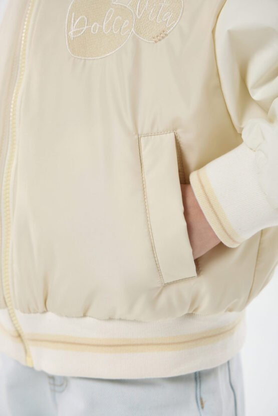 Կողային ճեղքավոր գրպանները ավելացնում են գործնականությունը՝ թույլ տալով անհրաժեշտ մանրուքները միշտ պահել ձեռքի տակ։ Կայծակաճարմանդով փակումը բոմբերն ավելի հարմարավետ և ֆունկցիոնալ է դարձնում։ Բաճկոնի առջևի հատվածի ծավալային ասեղնագործությունը ստեղծում է հետաքրքիր շեշտադրում և ընդգծում կերպարի յուրահատկությունը։ Օձիքի, թևքերի և ներքևի հատվածի կոնտրաստային գծերը բոմբերին հաղորդում են այս սեզոնի ուլտրանորաձև տեսք։